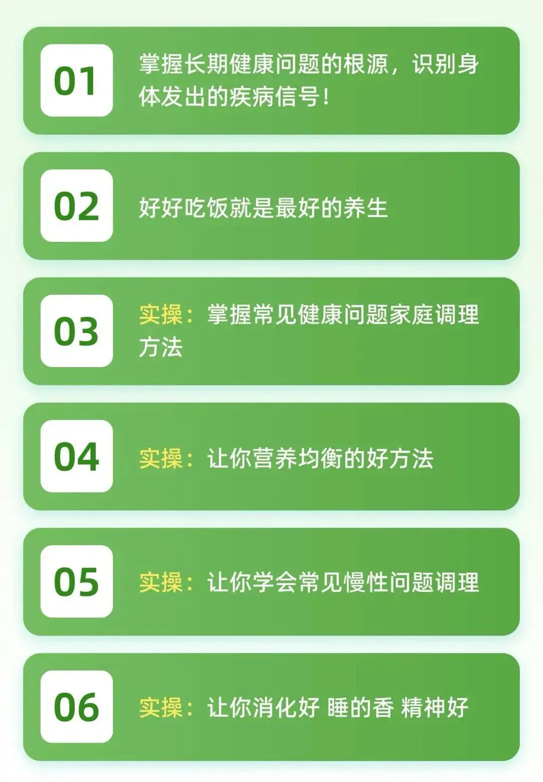 教大家通过“吃什么、怎么吃、吃多少”针对性的调理身体慢性问题,例如:四高、糖尿病、脂肪肝、失眠等等,让自己能科学改善肥胖身材,调理营养健康。
