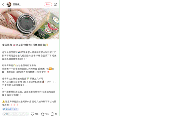 后来一查,发现它在国内也有得卖。(感觉白空运回来了)还是国内首款原装进口的泰国青草膏。