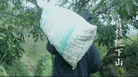 捡好的山核桃装进麻袋,从山上运下来只能靠徒步背下山,整整2小时的山路。一定不能快,要不然人、山核桃都得翻下山。