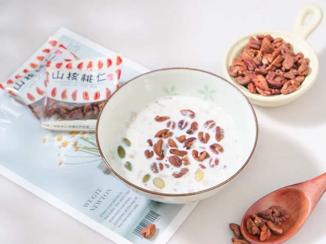 暖暖又研究出一个新吃法,用山核桃仁拌酸奶口感奇妙!还能弥补早餐的品种单一。