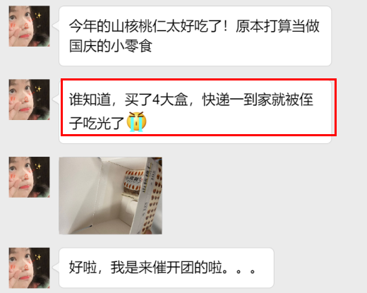 9月初的时候,暖暖开团过一次,每天都收到无数好评:2022山核桃仁太好吃了☟一到家就被抢空!