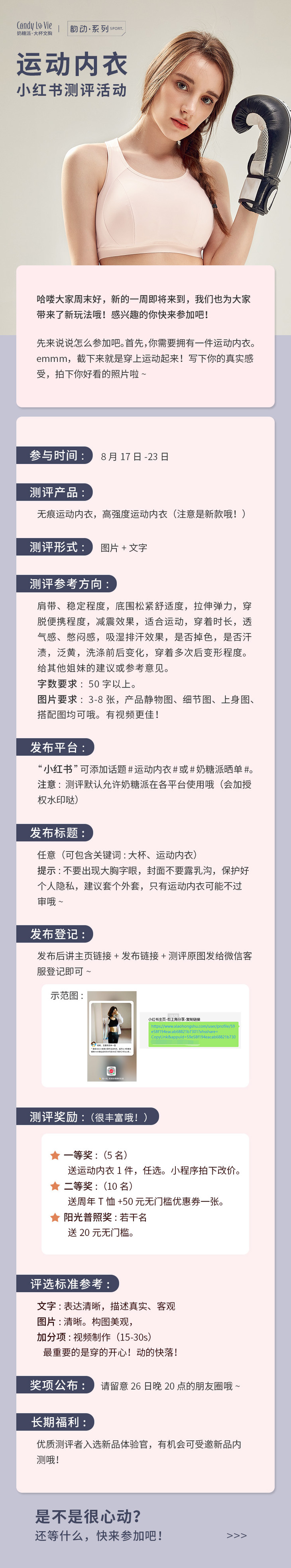 即日起到8月23日,运动内衣可享受专属八折优惠,如果你还缺一件运动内衣,那么趁这个机会下单参加吧!奖品丰厚,只要参与就有收获!