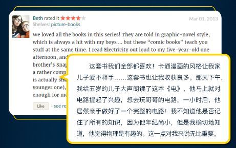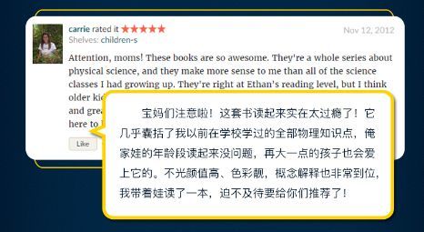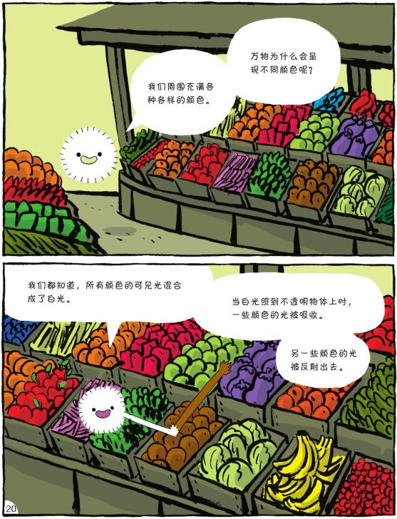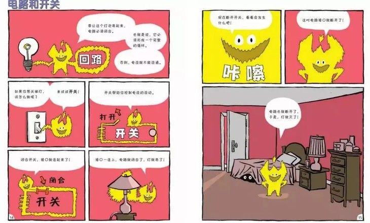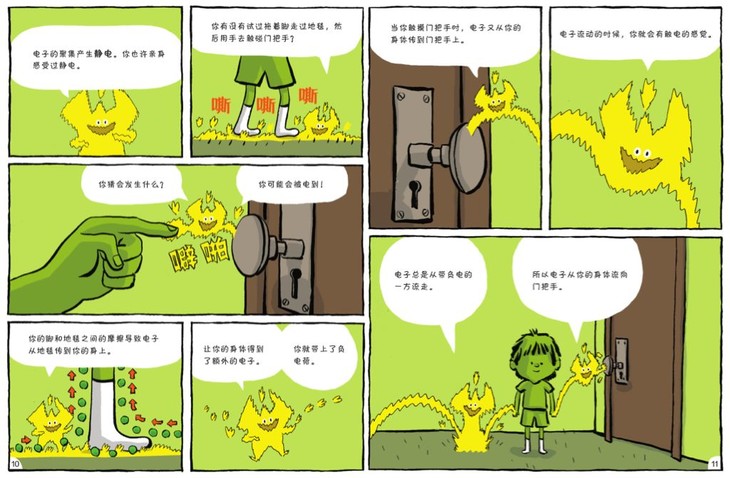 书中基本上涵盖了中学物理课本85%以上的考点和知识点。物理的学习,其实这样一个过程,先感知后理解,而传统的物理学习,则是先告诉孩子公式、定理,再让孩子去理解判断,这恰恰是违背孩子学习规律和大脑思维特点的。而这套书,恰恰符合孩子的思考能力和思维习惯,国外小朋友的喜爱之情无以言表。它在试图拉近孩子跟科学的距离,也在用浅显的语言解读深奥、严谨的科学知识,让孩子从小建立科学的兴趣,建立科学学习的自信心。比如,用孩子熟悉的水果,引出问题:万物为什么呈现不同的颜色呢?为什么我们眼睛看到的香蕉是黄色的?生活中的静电是怎么产生的?电荷是怎样从地毯,通过你的身体,再传递到门把手上的呢?在生活常见的物品中,认识物质的属性,比如大小、颜色、形状、质地等等。还有我们不到的属性,比如物质是否有磁性,是否能够溶解? “力”和“运动”化身为形影不离的好朋友,这样孩子就容易理解了:在踢足球、玩橄榄球、滑冰、乘坐火箭的故事情节中,让孩子可以亲身感受力、摩擦力、重力的物理现象。对于电,孩子看不到,是很抽象的,书中通过各种拟人手法把电流、电路讲明白了。中学物理关于电的学习,是很多孩子的重灾区,如果早点儿看到这一页,估计就不会那么发愁了。每一本书中的知识点都是全面的,像这里,还讲到了发电、新能源等很多电的相关话题。每本书的最后一页,都是主题的再次延展和升华,比如“为什么要学习力和运动”,就是进一步启发孩子了解物理知识的重要性。尤其是书最后一页的专业词汇表,不仅起到巩固提高的作用,也可以起到很好的检索效果。没有枯燥的公式,不用死记硬背物理原理,孩子学物理来自然就是轻轻松松。 NO.2