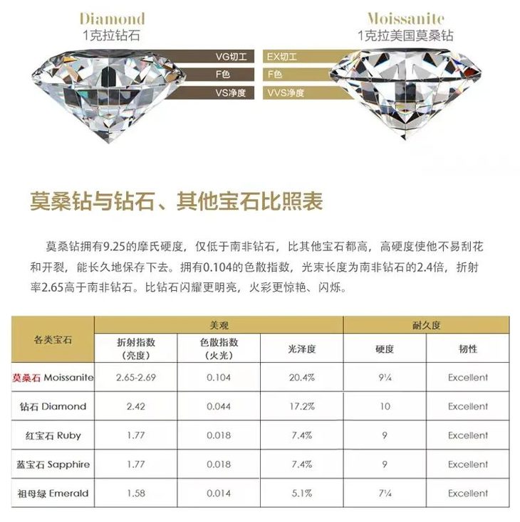 莫桑钻无论从内部结构、外观、数值上都与钻石有超高的相似度