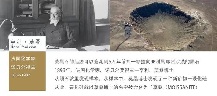 直到1904年,法国著名化学家Henri Moissan才在美国亚利桑那陨石坑中发现了一种异常耀眼的晶体状矿物粒子,它由一种新矿物——碳化硅结合而成,与钻石极其相似,肉眼很难分辨!