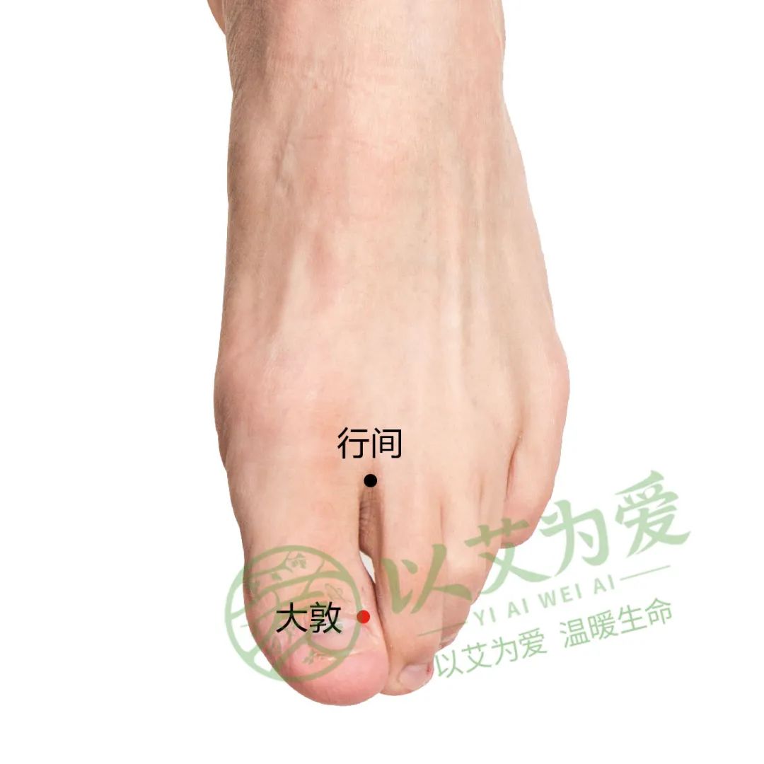 出《灵枢·本输》。别名水泉、大顺。一说“足大指爪甲根后四分节前”(《针灸集成》)。敦,厚也。在足大趾端,喻其趾端敦厚;又穴当厥阴之初,厥阴根于大敦,穴处脉气聚结至博至厚,故称为大敦。正坐伸足或仰卧位,从拇趾趾甲外侧缘与基底部各作一线,于交点处取穴。