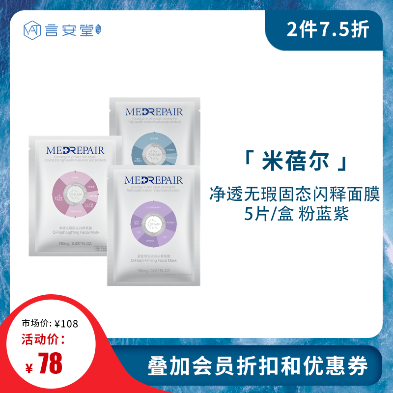 主打成分愈创木薁磺酸钠+专利成分熙敏修™复配协同,镇定抗敏,加乘缓解肌肤不适,即时舒适、止痒的效果感觉的到~复配的薄荷醇乳酸酯敷上去凉凉的好舒服!洗完皮肤平滑透亮!牡丹根提取物&芍药根提取物,都具有出色的抗菌效果,除此之外还能配合孔雀石提取物促进蛋白酶活性,增强焕亮功效。核心成分山毛榉紧致精华(玻色因)+蓝铜胜肽的加持,对改善细纹干纹、紧致肌肤有一定的功效!米蓓尔轻龄紧致修护面膜110g,日常价148元,本期品牌日限时团仅118元加送同款小样6g*5个,2月17日10:00-2月18日10:00团购销量达到500,再加送同款小样6g*5个!米蓓尔净透无瑕固态闪释面膜 5片/盒 粉蓝紫 活动价78元,购买同款两件75折。