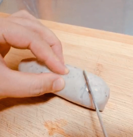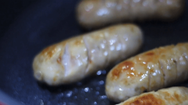简单在肉肠上划上几刀(也可省略),煎起来特别方面,呲呲冒油 。