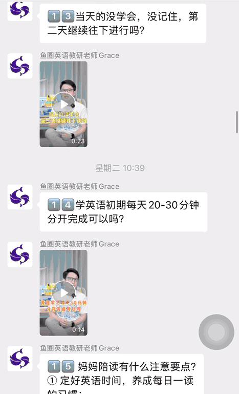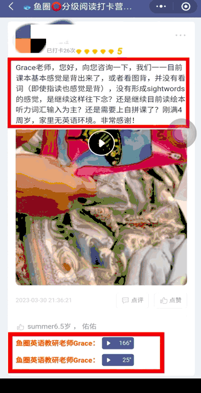 老师针对视频阅读情况对孩子进行鼓励,示范正确的读法、轻重音等发音,帮助孩子纠正发音。