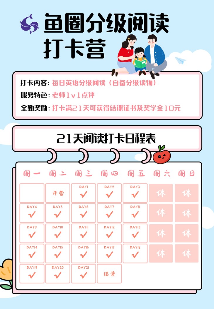 为期21天的阅读打卡营,目的在于让家长对于分级阅读以及自家的孩子怎么用好分级有更明确的方向,且有方法有信心去坚持阅读。