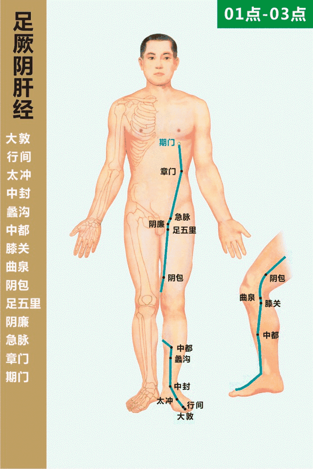选取足厥阴肝经的循行路线,进行经络敲打,每次敲打1个来回,每日2次,10天1疗程。