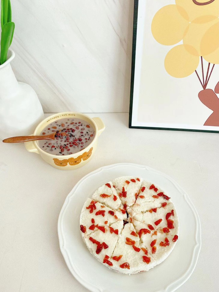 1、蔓越莓干用适量的蔓越莓果汁泡软,将粘米粉和糯 米粉,糖粉,混合均匀分成两份,一份加入牛奶,一份 加入蔓越莓汁,用手搓成颗粒状,过筛一遍。