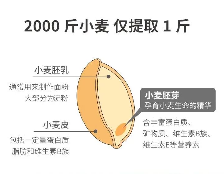 它是小麦的核心和生命,植物称为胚,相当于动物的胎盘。它虽然仅占麦粒重量的2.5%,但营养却占整个麦粒的65%。