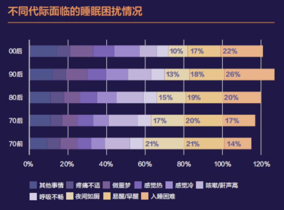 《2024中国居民睡眠健康白皮书》中显示,我国居民平均睡眠时间为6.75个小时,整体睡眠质量欠佳,特别是70、80后,入睡难、频繁夜醒、多梦、精神紧绷都是常见问题。