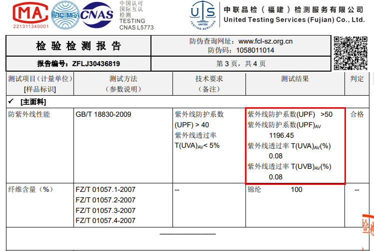 UPF50+附检测报告