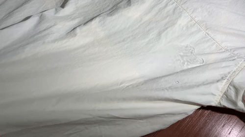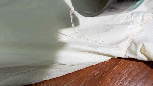 水泼在衣服上会在衣服表面形成水珠并迅速滑落,不会渗透。