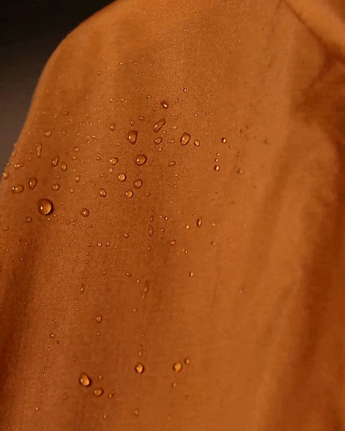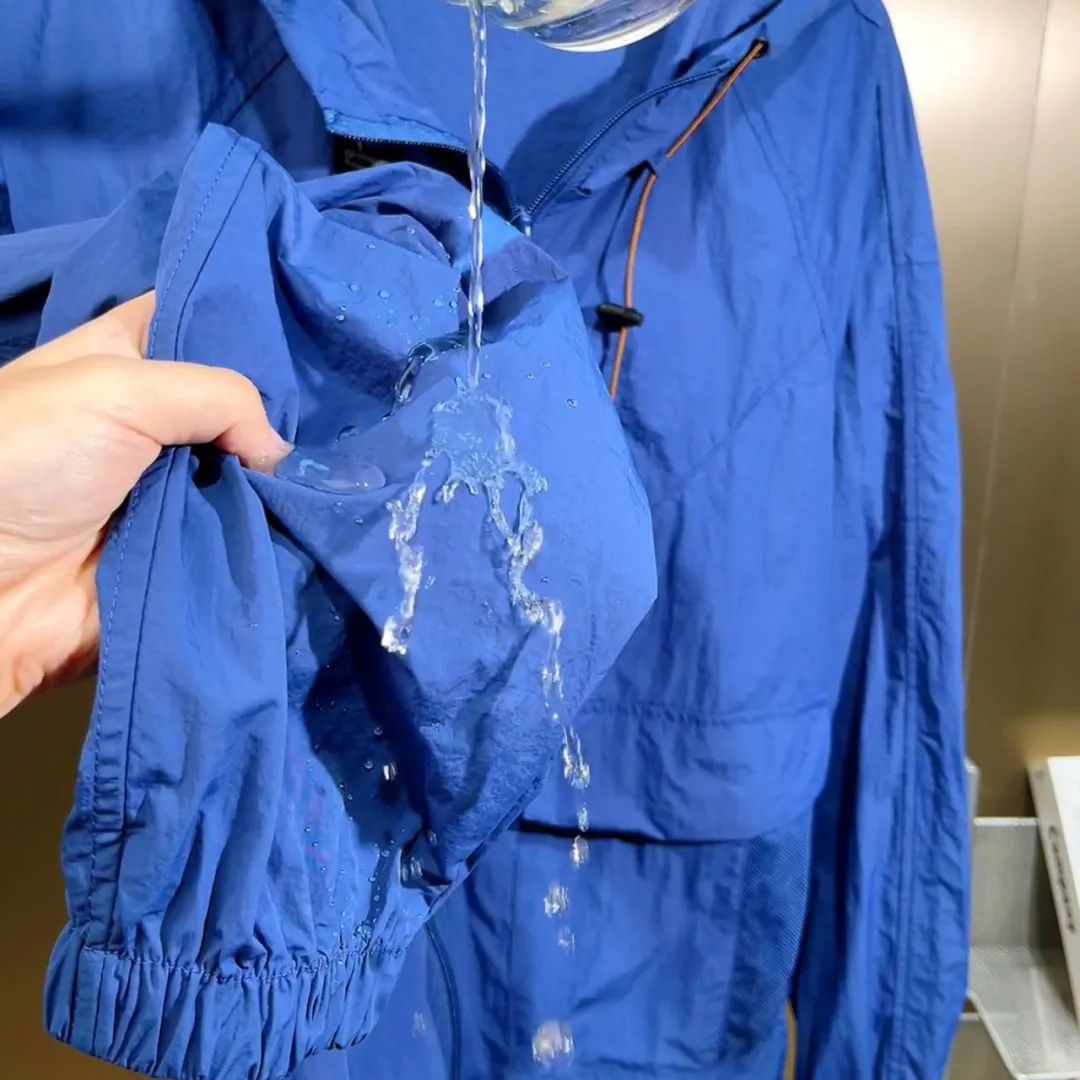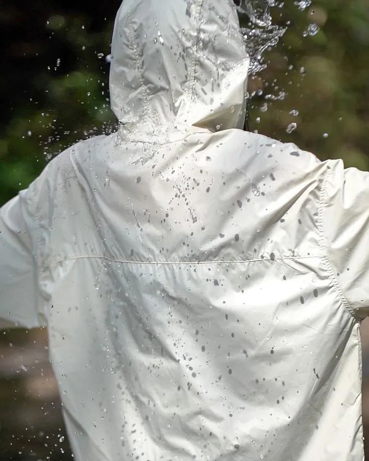 其次,面料还采用了新型科技材料,让衣服具备了荷叶式拒水效应。