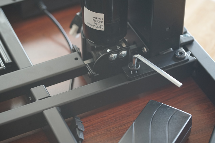 整个产品被分为了三部分:桌面、桌子腿还有可调桌脚。而它们之间的组装非常方便,只需要通过六角扳手拧上螺丝就可以完成组装。整个过程并不复杂,比起一些动辄需要对着视频一步步组装的产品来的要轻松的多。学习成本真的低很多,暴赞。