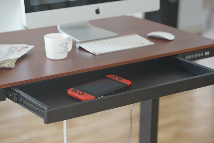 抽屉的右侧是乐歌E5升降桌的控制区域。这块区域也是桌面的控制核心,由一块小的LED屏幕、六个触控式按钮组成。