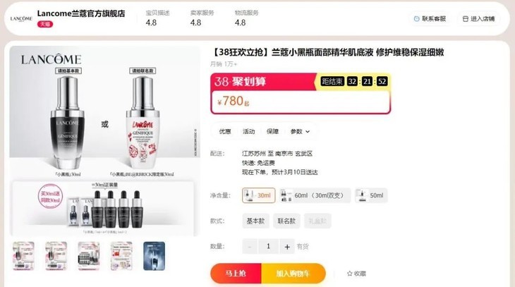 毕竟,光是一瓶30ml的小黑瓶兰蔻官旗就要780元了!