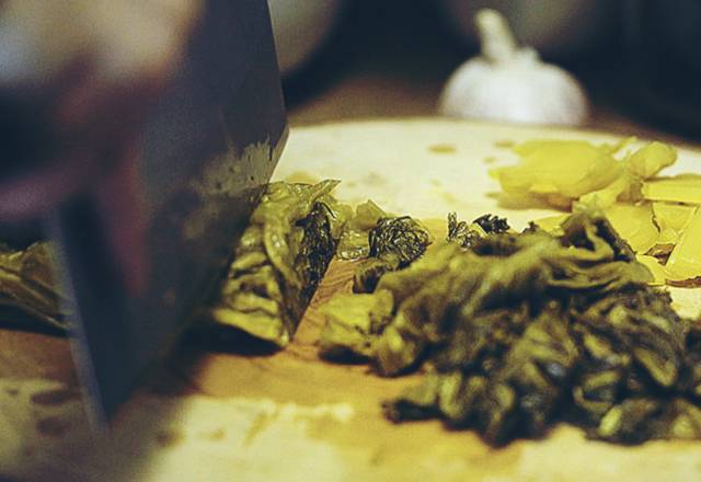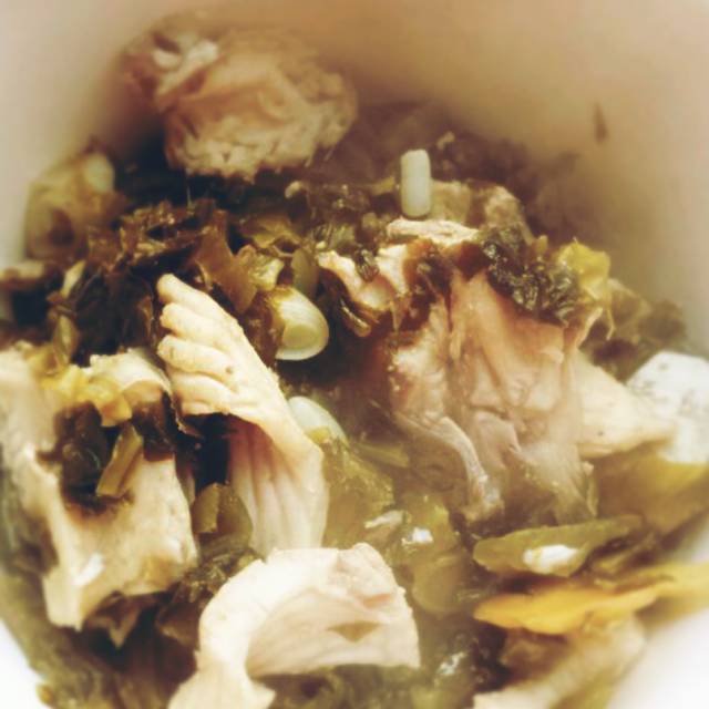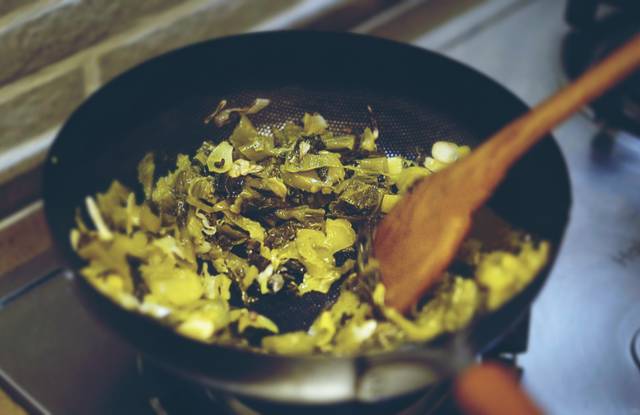 3、四川酸菜切片或者切丝,清水投洗3~5遍,挤干水分备用;