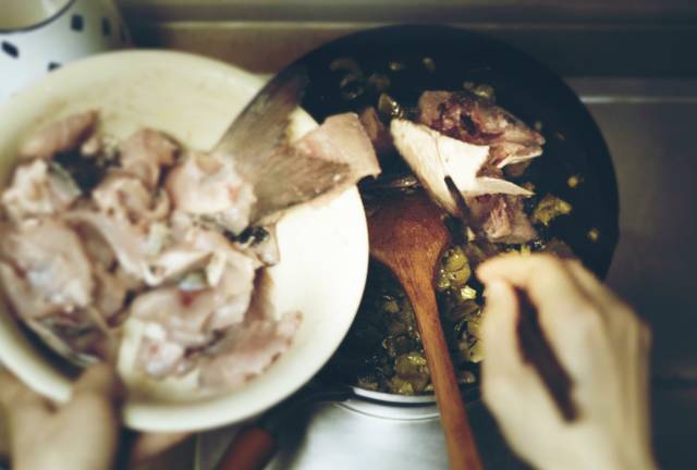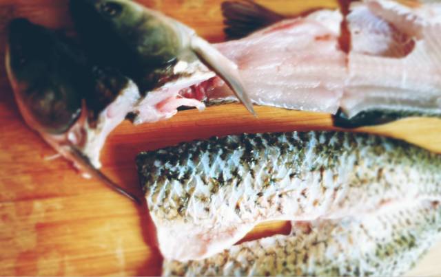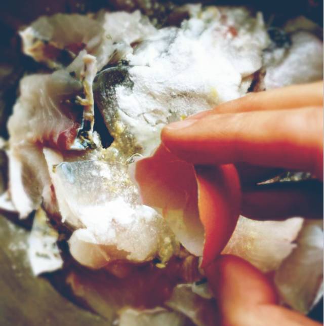 3、鱼头、鱼骨肉色变白,捞出来放在盆里;
