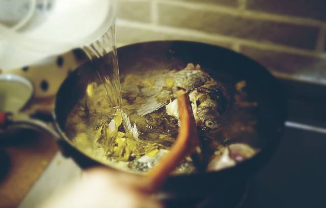 2、放入酸菜翻炒,见锅底油被“吃”没了,放入鱼头、鱼骨,调入2勺料酒,添入3斤凉水,开最大火,炖煮5~6分钟;