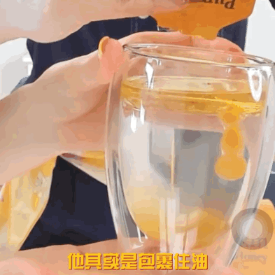 暖暖还做了一个实验,在杯子里倒上油,把南瓜酵素放进去,可以看到南瓜酵素包裹住油,变成一团沉下去了,真是太惊喜了!