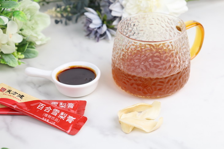 「百合雪梨膏」选用百合、黄精、茯苓、玉竹、蜂蜜、橘皮(陈皮),历经20小时匠心熬煮,采用低温高效浓缩而成。