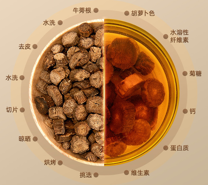 严格挑选原料,健康工艺也不能落下。水洗、去皮、再水洗、切片、晾晒、烘烤、每一步都遵循健康原则,尽可能保留牛蒡根中的维生素、蛋白质、钙、菊糖、水溶性纤维素等营养成分。
