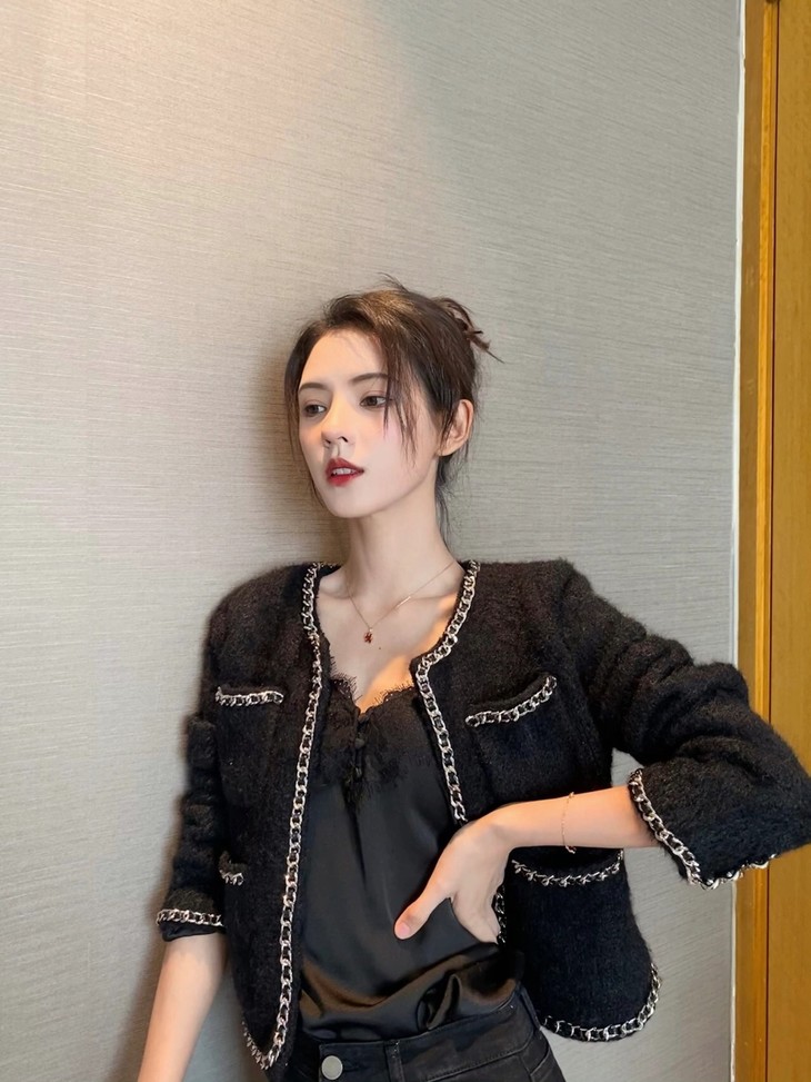 黑色小香风外套搭配蕾丝内衬