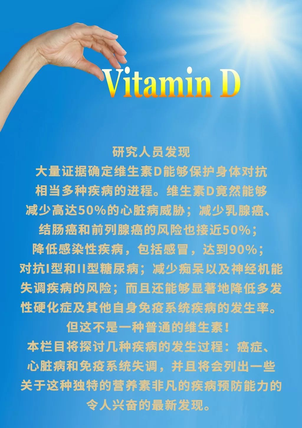 “哈佛大学近期发表的一项研究表明,维生素D水平偏低可能会使发生心脏意外的风险以梯度的形式增大至242%,即该风险水平的增大成比例地伴随着维生素D水平的降低[20]。同样,维生素D水平的高低与深静脉血栓(腿部主要静脉发生栓塞,可导致急性肺动脉栓塞)的发生风险成反比。在瑞典进行的一项研究显示,血栓并发症的发生风险也呈现出季节相关性,即冬季发病率最高,夏季则最低。而维持高维生素D水平能增强身体的抗凝血功能,降低发生炎症和血栓形成的风险。”
