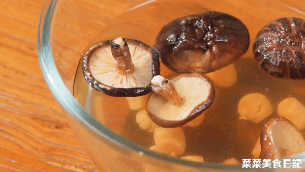 4.香菇干贝提前半小时洗净泡发,泡发香菇挤干水分,干贝捏碎