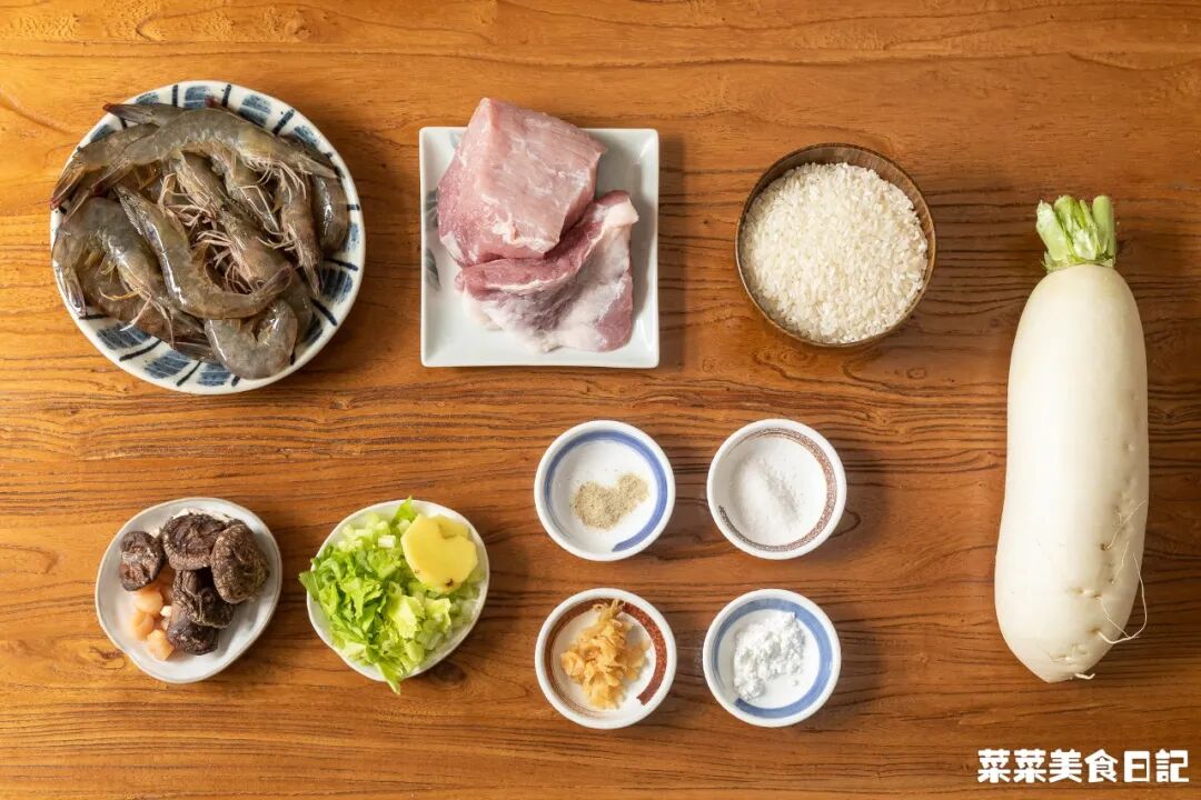 五常大米150g 白萝卜400g 干香菇5朵 干贝10颗 鲜虾250g 梅花肉/水晶肉/二层肉150g 冬菜1-2大勺 小香芹2根 姜片2片 盐1小勺 胡椒粉1/2小勺 淀粉1/2小勺