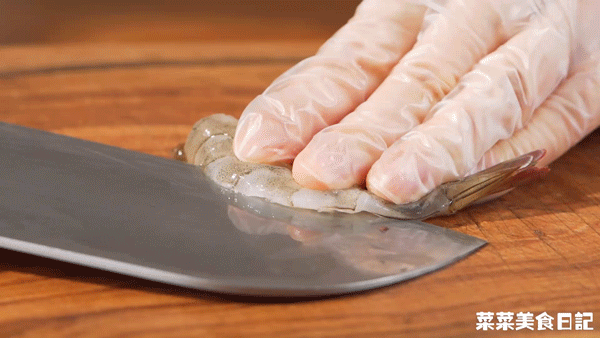 2.虾身去壳开背清理干净虾线,梅花肉/水晶肉切薄片