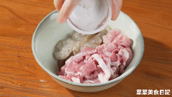 3.虾仁和肉片加入1/4小勺盐、1/4小勺胡椒粉、1/2小勺淀粉、1小勺油腌渍片刻