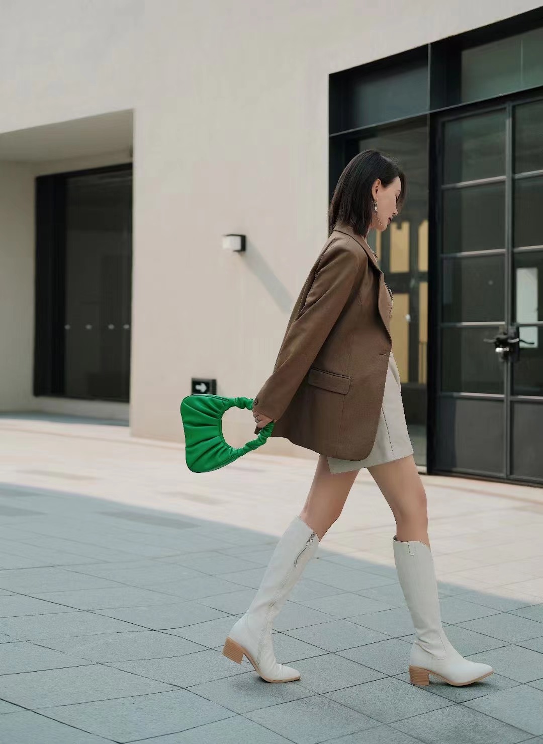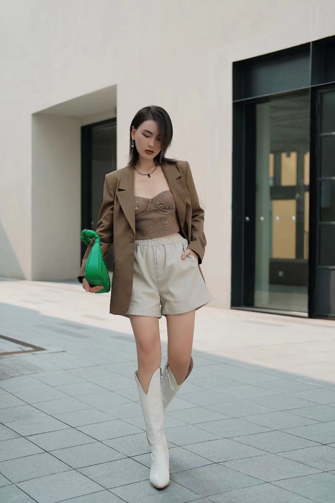 橄榄绿气质绝了,内搭一件同色系的抹胸吊带,出街气场全开,在凉凉秋意中也要keep住酷飒~