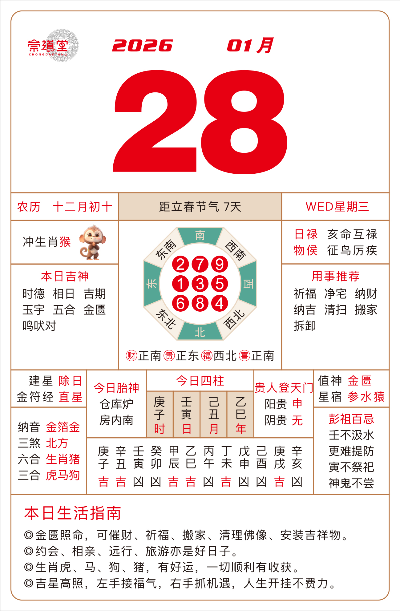 2026年1月28日 农历十二月初十 壬寅日 冲猴