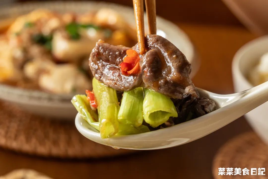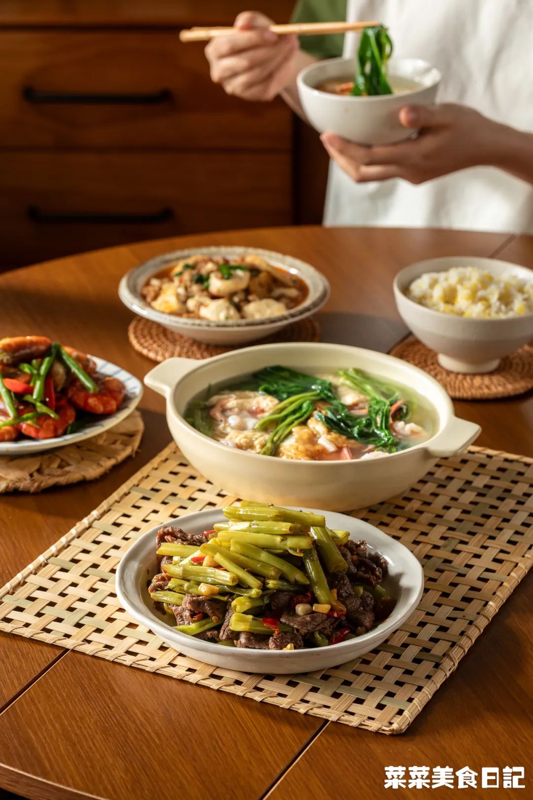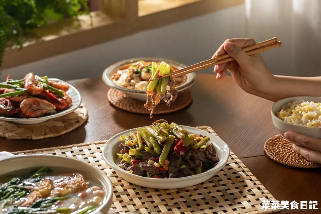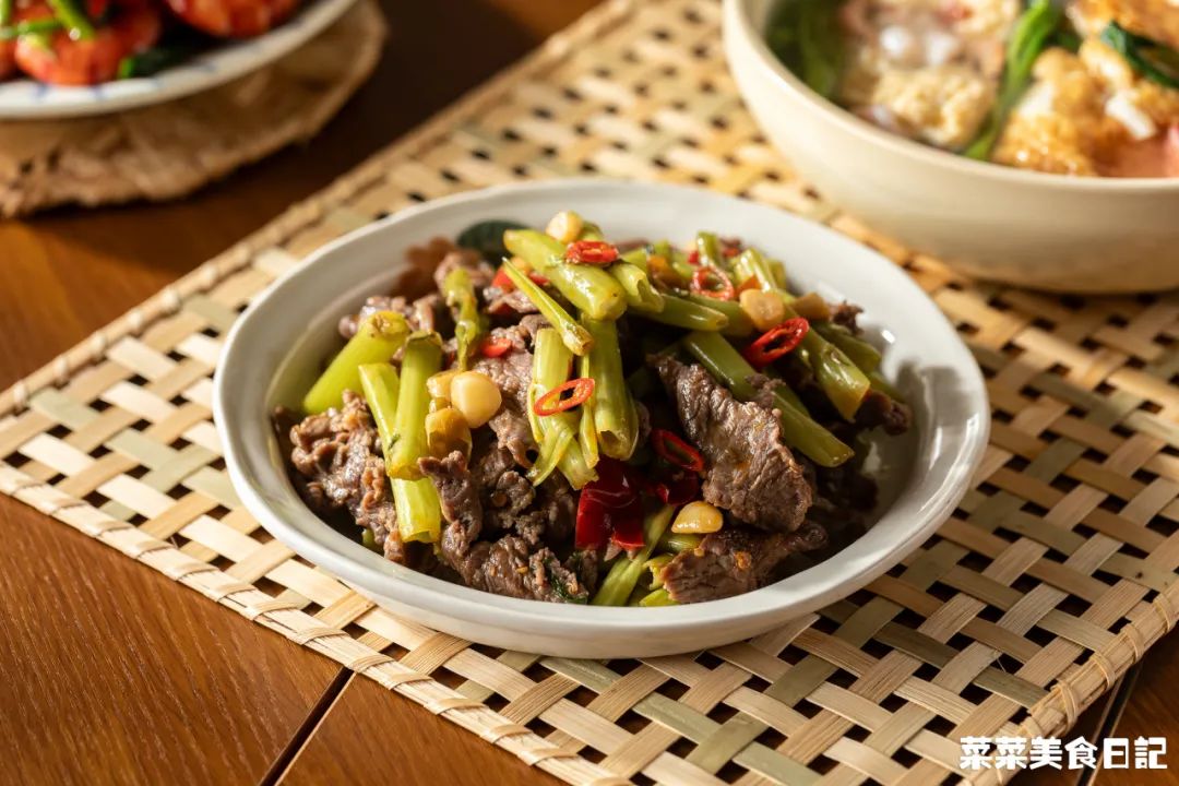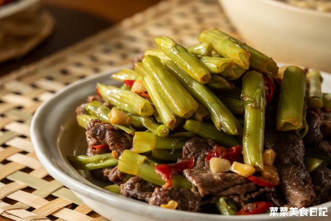 - 酸辣空心菜梗炒牛肉+空心菜叶鸡蛋汤 -