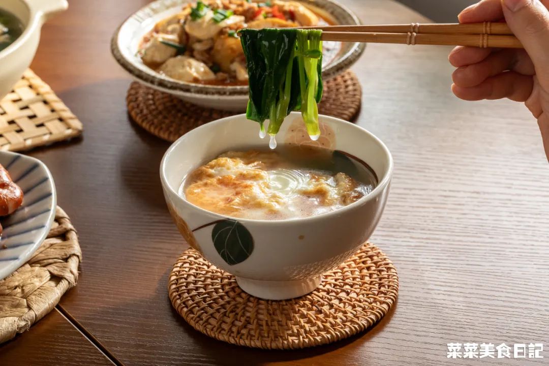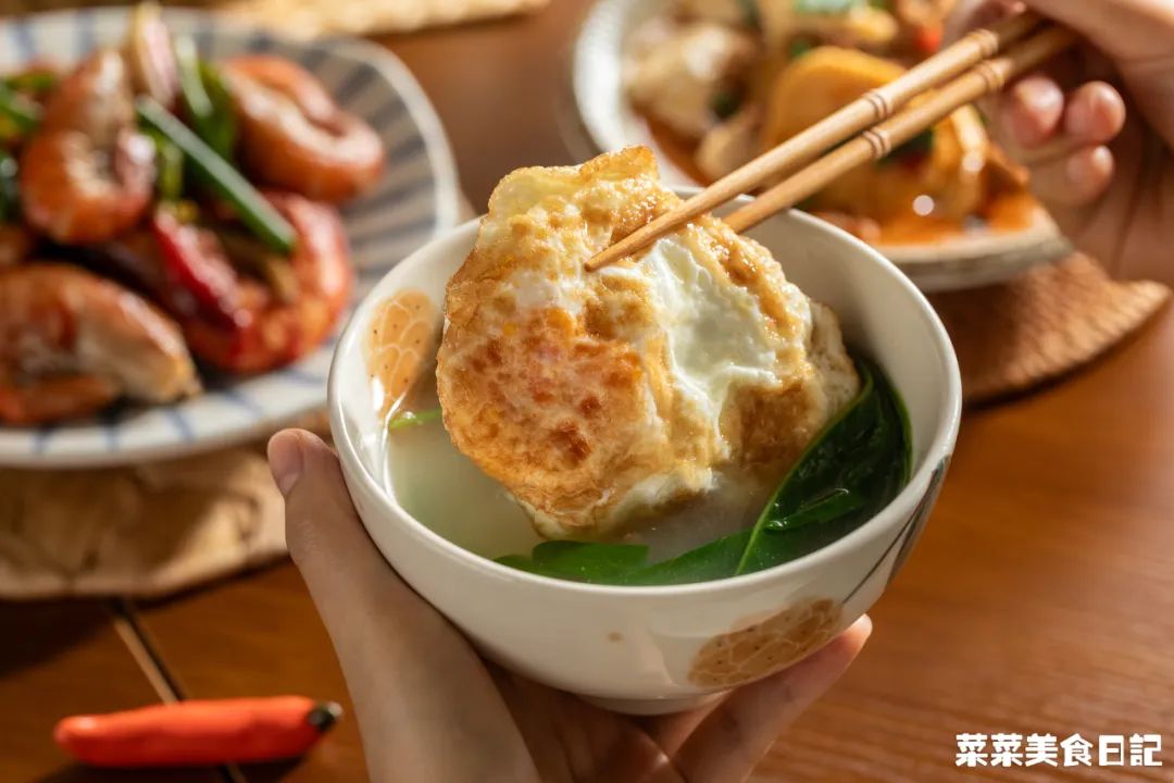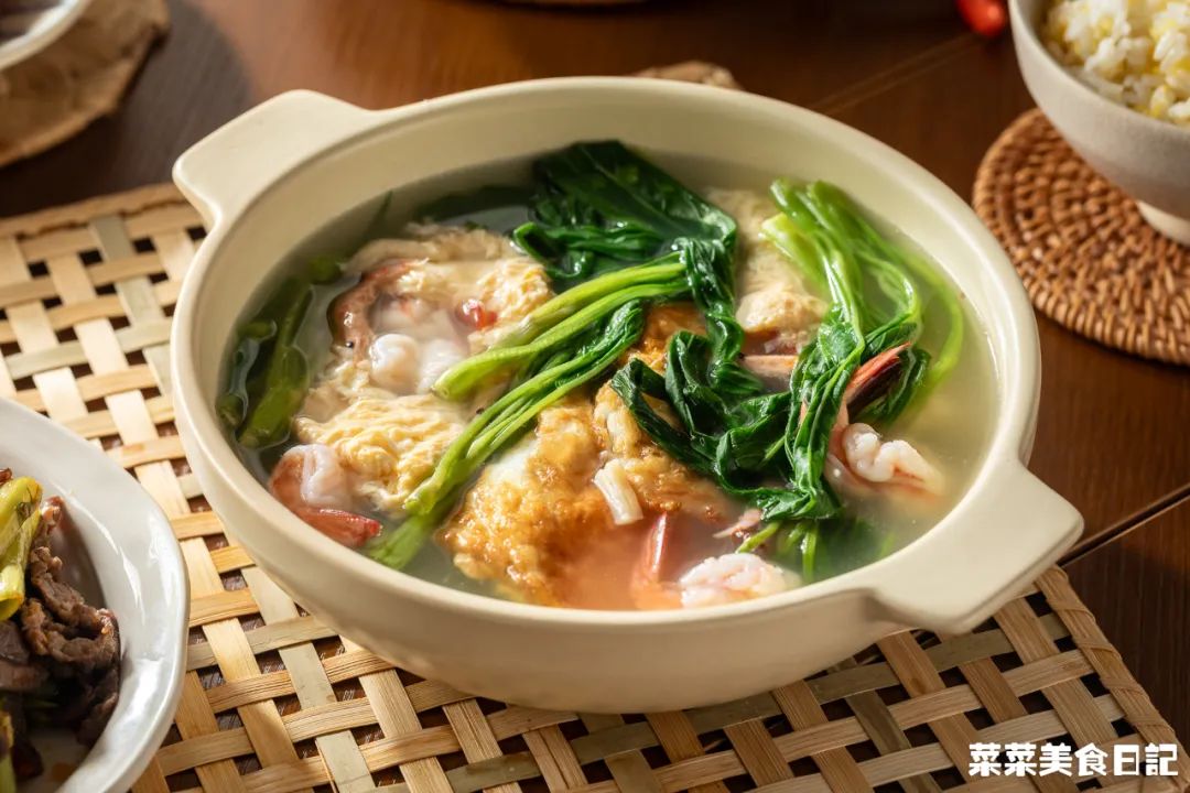 1.起锅热油加入3个鸡蛋煎至金黄,加入泡发的干贝、虾皮、姜片、热水煮3分钟