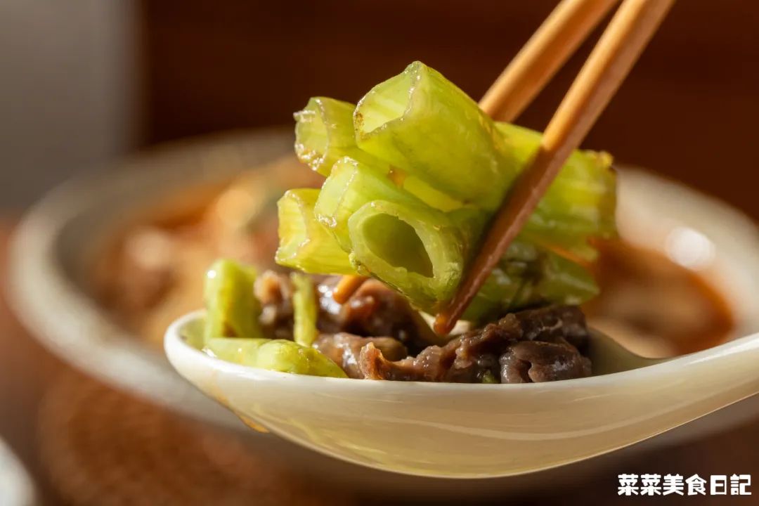 5.加入牛肉、1大勺生抽、1大勺泡椒水/米醋大火翻炒30秒出锅