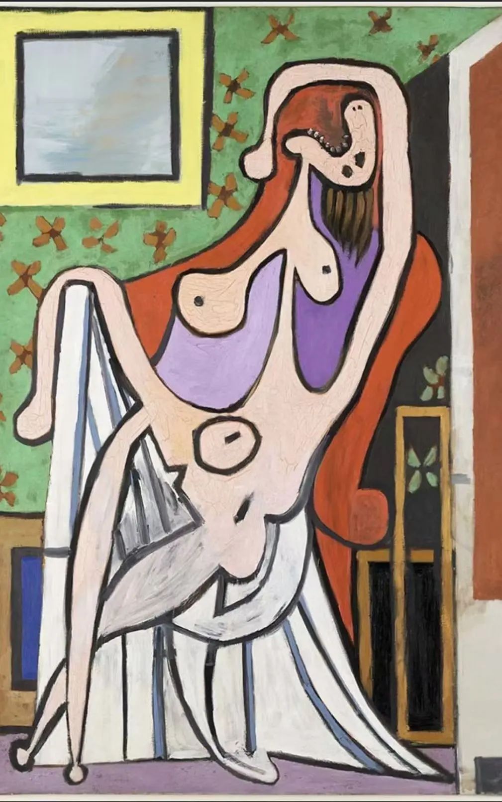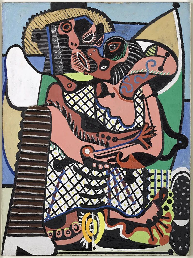 馆藏毕加索蓝色时期标志性作品《自画像》;1909年的《圣心堂》(Sacré-Cœur)是立体主义的代表作品之一;新古典主义时期作品《潘的风笛》(The Pipes of Pan)、沙滩上奔跑的两女人(Two Women Running on the Beach);超现实主义时期作品《坐在红色扶手椅上的裸女》(Grand Nu au fauteuil rouge);《吻》(The Kiss)以狂放的笔触回归真实情感表达,呼应早期的创作激情。