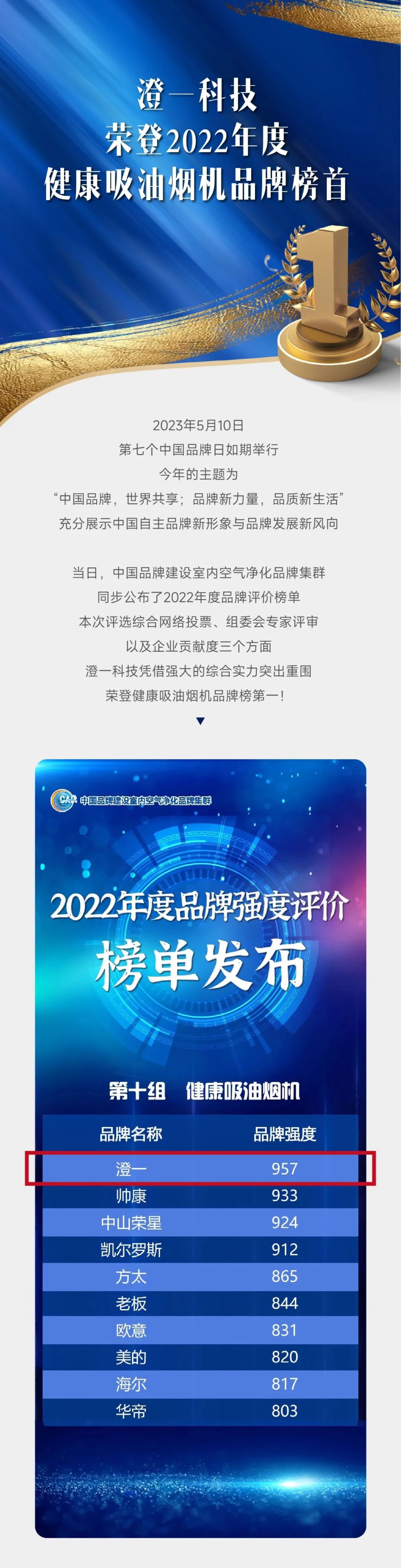 中国品牌日|澄一科技荣登2022年度健康吸油烟机品牌榜首