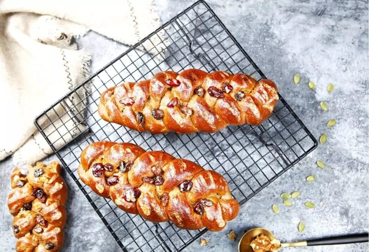 发酵为原来体积的2倍大;表面刷一层全蛋液,撒上蔓越莓、提子干、核桃仁等,挤上沙拉酱;