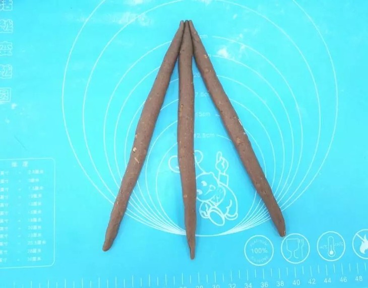 全部的面团成型以后,拿起第一个成型过的长条,再次搓一下,三个长条为一组,顶部手指捏一下;