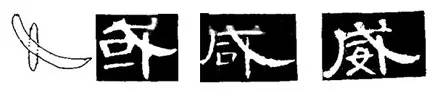隶书中有一种情形值得注意,即以竖代撇现象较多。主要表现在书写楷书戈钩的短撇上,如“或”第七笔,“威”第八笔,“咸“第八笔。