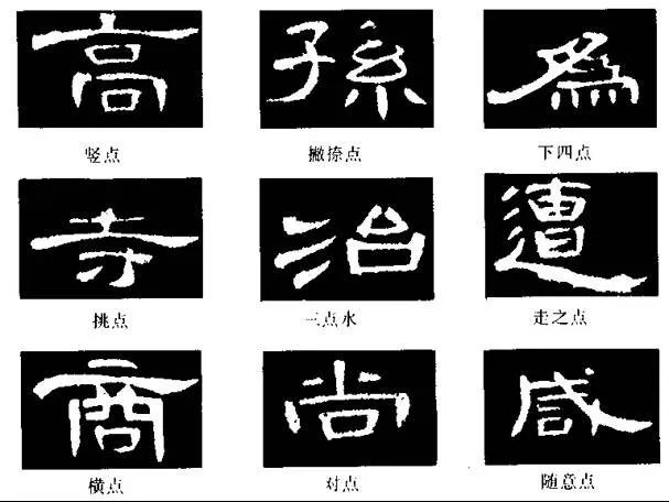 点画在隶书中处于发展状态,多利用其它笔画如横、竖、撇、捺来代替。真意思的是,隶书中的点没有楷书中的基本点—圆点。