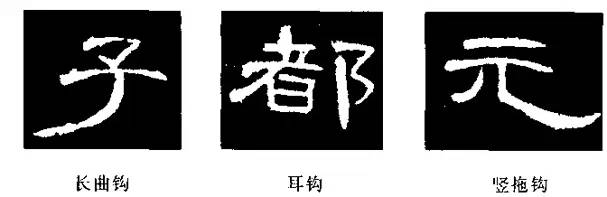 有左向竖钩,右向竖钩两种。起笔如竖,行至出钩处向左(或向右)滑行,回锋收笔,钩圆而不挑。其小左向竖钩往往成为隶字中的主笔 如“事”、“于”。