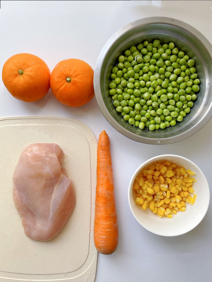 1、冷冻豌豆用冷水解冻,鸡胸肉、胡萝卜洗净切小块 备用。