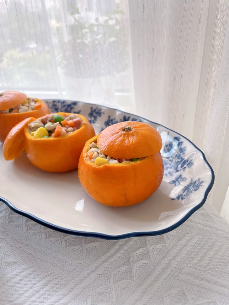 3、子切去顶上的一片,把果肉取出来,注意不要把皮 弄破。然后把搅拌好的鸡肉玉米等用勺子放在橙子里。